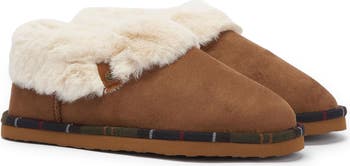 Evoke visions of crackling logs and cozy cabin getaways in this scuff slipper lined with luxuriously plush faux fur and traced with Barbour's signature tartan.