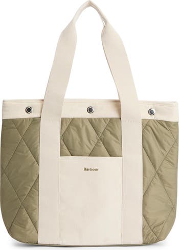 Barbour's signature tartan makes a subtle appearance at the lining of this diamond-quilted tote contrasted with soft corduroy accents.