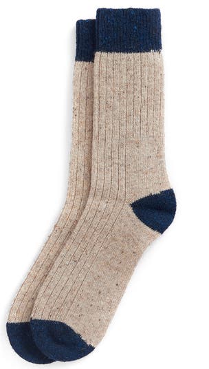Wool warms the soft yarns of these hearty socks knit with a tweed look and contrasting toes and heels.