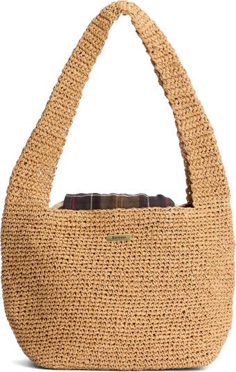 A British take on beachy style, this crocheted-raffia shoulder tote comes with a cotton-twill lining and a tartan-wrapped drawcord closure.