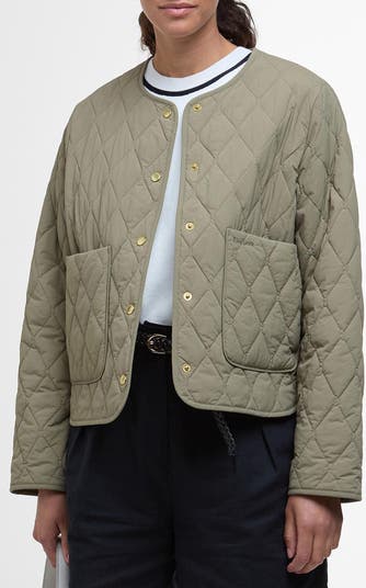 A lightweight, slightly cropped quilted jacket makes an easy third layer for in-office days with it's collarless design for effortless pairing with collared tops and side slits for an eased fit at the hips.