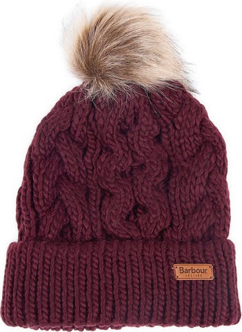 A plush faux-fur pompom tops a classic beanie cable-knit from chunky yarns and finished with a leather logo patch.