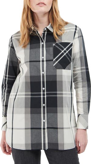 Rendered in a longer length, this button-up is crafted of breezy cotton and patterned in a tonal plaid print.