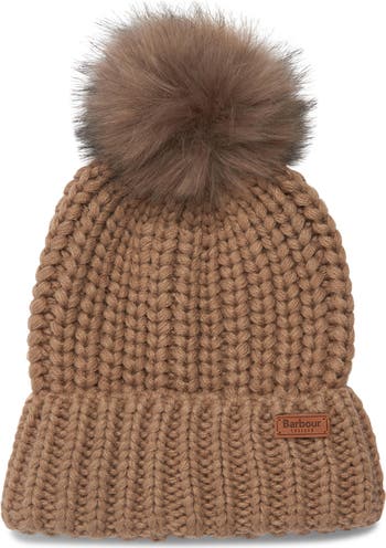 A fluffy faux-fur pompom tops a cozy beanie featuring a chunky shaker stitch and logo-embossed patch.
