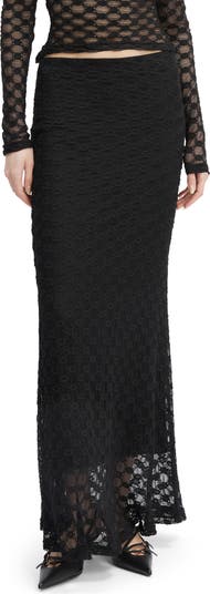 A flowery lace overlay enhances the modern romance of this occasion-ready maxi skirt.