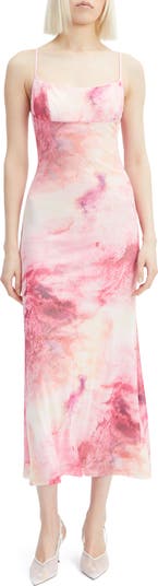 An empire waist lends an air of sophistication to this printed midi dress made of stretchy mesh.