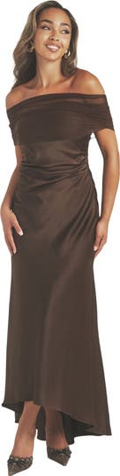 This modern silhouette features a flattering Bardot neckline with a removable mesh overlay that adds texture, movement, and styling versatility. The Bardot neckline has a silicone tape for support and the mesh is stretchy for a comfortable fit. The dress is crafted from a semi matte satin fabric and has a trendy, high low hem, creating a small train. Perfect for wedding guests and evening occasions alike.
