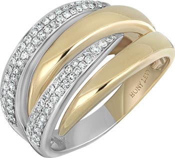 This wide band ring makes a luxurious statement with alternating, tapered rows of 18-karat white gold sparkling with pavé diamonds that catch and reflect the light and highly polished 18-karat yellow gold.