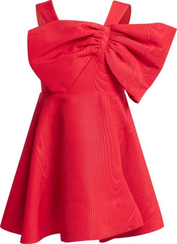 A subtle jacquard pattern lends depth to this kid-sized party dress with a boldly ruffled bow in the front for playful flair.