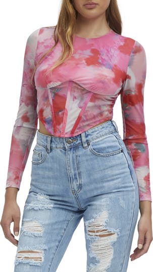 Corset-inspired details like structured boning at the waist and a dipped hem create sultry style on this mesh top covered in an abstract floral print.