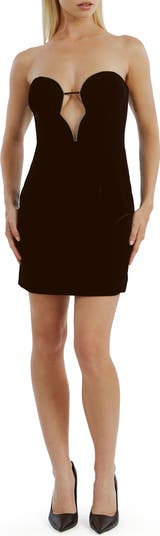 This stunning velour minidress boasts a plunging front that's outlined by shimmery details and held together by a thin strap.