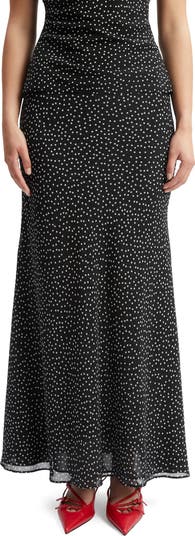 Bright polka dots embolden this smooth chiffon maxi skirt cut in a drapey A-line silhouette.