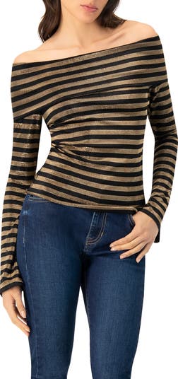 Long sleeve blouse featuring a bardot neckline and stylish stripe pattern, perfect for a chic and modern look.