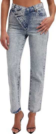 A crossover waist is beautifully balanced by straight legs in these wear-everywhere jeans that deliver a throwback vibe in acid-washed nonstretch denim.