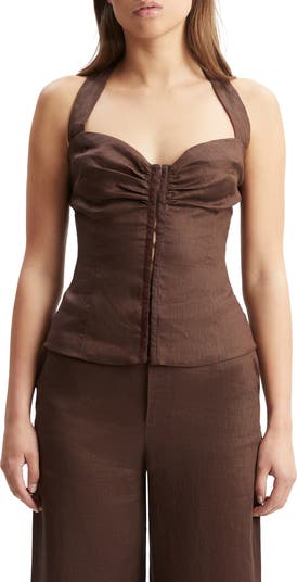 Show off your shoulders and back in this crisp linen top designed in a corset-like silhouette with smocked accents for easy movement.
