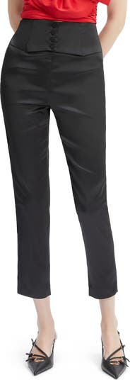 Slim satin pants incorporate a corset detail to make them a sultry selection for your next night out.