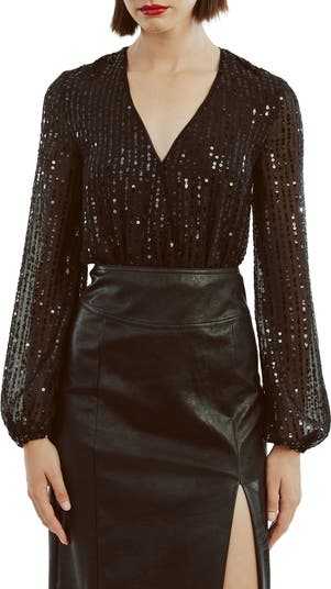 Get ready for your next night on the town in this simmering sequin bodysuit detailed with a wrapped front and long blouson sleeves.