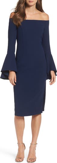 An off-the-shoulder neck tops this chic cocktail dress designed with dramatic bell sleeves and a chic midi-length hem spliced with a soaring side slit.