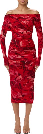 Bare Body Print Off the Shoulder Long Sleeve Midi Dress