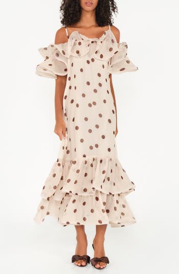 Bring the drama in this summery chiffon maxi dress boasting sweet polka dots, soft ruffles and a playfully tiered hem.