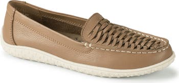 A woven vamp and moc-stitched toe enhance the casual feel of a soft leather slip-on constructed with lightweight cushioning and a flexible grip sole.