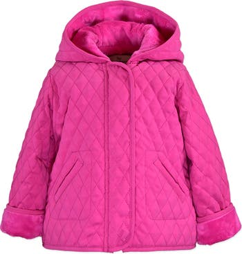 Little ones can stay warm in this diamond-quilted jacket lined with soft and fuzzy pastel-pink faux fur.
