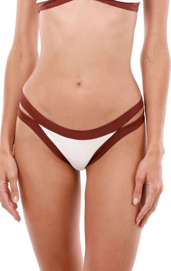 Colorblocked edges neatly outline these quick-drying bikini bottoms framed by cutouts at the sides.