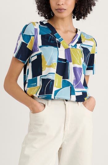 A pleat below the V-neckline releases to ease the fit of this top for a silhouette that makes the most of the soft, drapey cotton-blend fabric.