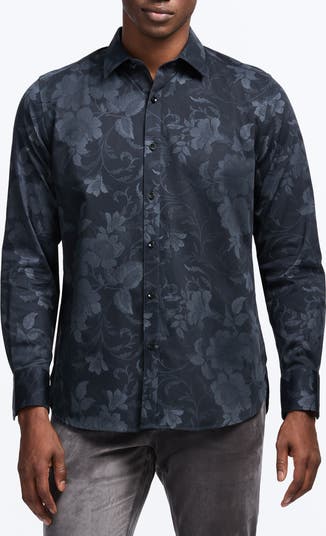 Shadowy flowers bloom in dusky pewters and greys on a shirt tailored from naturally stretchy cotton satin with subtle pops of contrast that show when you unbutton the collar and roll up the cuffs. Wear it tucked or untucked to go from elevated to casual without ever sacrificing your style.