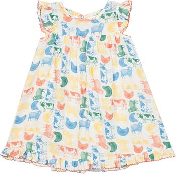 This girl's dress features a playful multicolor farm-inspired print. Designed with flutter sleeves, delicate ruffle trim along the hem, and a relaxed A-line silhouette, it?s lightweight, breathable, and perfect for sunny days. Fabric Care 100% COTTON Machine Wash Cold | Line Dry Do Not Bleach
