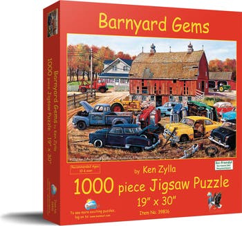 Unravel the beauty of rural life with the meticulously illustrated Barnyard Gems 1000 piece jigsaw puzzle by renowned artist Ken Zylla. This stunning display of classic vehicles and rustic barns captures nostalgic charm in final dimensions of 19" x 30", allowing you to connect with simpler times. Quality and precision are integral to SunsOut's high-quality, USA-made products. Experience the satisfaction of perfectly interlocking pieces made from recycled cardboard, promising a seamless fit and hours of immersive pleasure. The Barnyard Gems puzzle also celebrates sustainability, incorporating eco-friendly practices through its use of soy-based inks and recycled-board material. SunsOut's pledge to excellence is reflected in our worry-free guarantee, ensuring dedicated customer service should there be any issues with missing or damaged pieces. As a woman-owned small business, SunsOut proudly upholds American craftsmanship, offering puzzles that ignite imagination and radiate pride in every exquisite piece. Immerse yourself in the rhythmic tranquility of Barnyard Gems, where every piece tells a tale and every assembly evolves into an adventure fondly cherished.