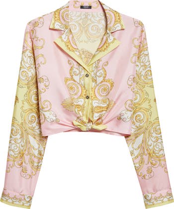 House codes collide in this cropped Italian-silk shirt, where lavish filigree and engraved Medusa-head buttons channel Versace's signature baroque glamour.