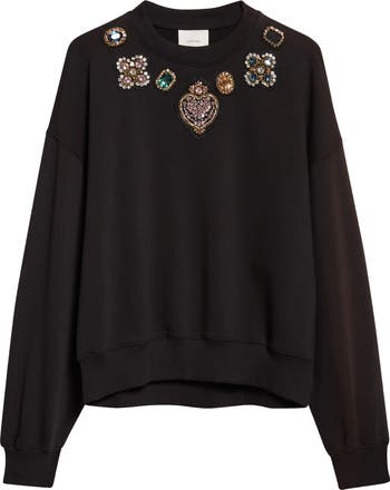 Lustrous jewels add elegance and shine to an otherwise cozy crewneck sweater framed by dropped shoulders for a relaxed fit.