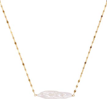 Baroque pearl piece, delicate and distinct. The Baroque Pearl Bar Necklace features a naturally shaped baroque pearl set along a delicate lace chain. Its organic shape gives the piece a little texture and quiet character. Wear it on its own or layer it with other chains. Designed at a slightly longer 17"–19" length, it layers effortlessly with your favorite pieces.