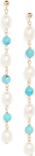 Polished turquoise beads juxtaposed against milky baroque pearls bring bold color to these handcrafted linear earrings.