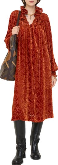 A dress made in Italy from silk blend velvet, debuted on the Burberry Winter 2025 runway. The intricate devoré fabric evokes the rococo-style flocked wallpapers found in British stately homes. Cut to a relaxed fit with smocking and ruffles to shape the neckline and cuffs.||Button closure|Self-tie collar|Elasticated cuffs with button and tie closure|Detachable silk slip dress