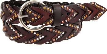 A woven leather belt with distressed character and stud detailing throughout. Designed for a timeless and textured appearance.