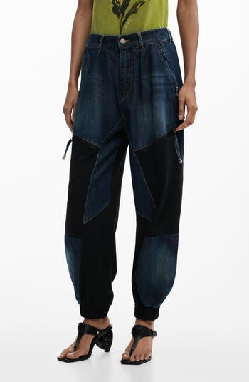 Patchwork construction and zip pockets heighten the casual-cool style of these trend-savvy barrel-leg jeans.