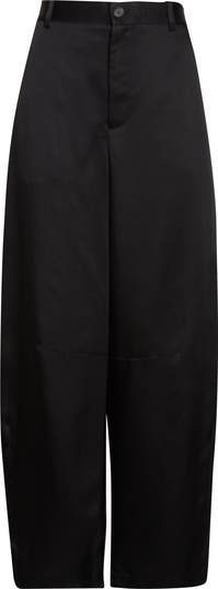 Horizontal darts help create volume in the barrel-shaped legs of these sculptured pants cut from silk-softened fabric.
