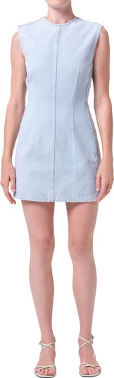 This denim sheath minidress is tailored from nonstretch regenerative cotton, shaped with curved seams that contour a sleek, flattering silhouette. Sleeveless with a clean crew neckline, it delivers modern polish with a sustainable edge.