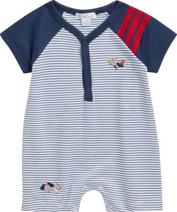 Embroidery of America's favorite pastime and the soft, breathable comfort of pima cotton make this striped romper a total homerun.