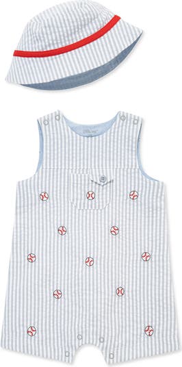 Your little one will be ready for sunny games in this lightweight cotton romper patterned in embroidered baseballs and finished with a coordinating hat.