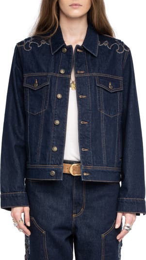 Get rodeo ready with this dark-wash denim jacket featuring frayed appliqués of contrast topstitching in traditional Western flame motifs.