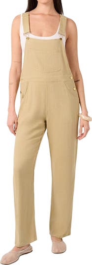 - This basic linen overall is cut for a relaxed boyfriend fit. It offers front, back, and bib pockets, a straight leg, hook-fastening shoulder straps, and shank buttons along the sides.