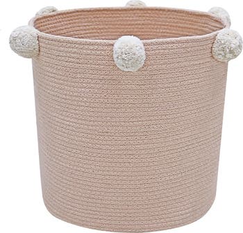 Braided cotton cord basket available in three colorways: Blue Sage with six Vintage Blue cotton pompoms; Chestnut with six Rose cotton pompoms; and Rose with six Natural cotton pompoms.