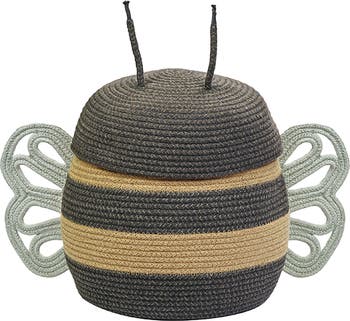 The Mama Bee basket is handcrafted using braided cords of recycled PET-bottles covered by cotton yarns, combining rows of Honey with mixed Dark grey cords. With two cords added as antennas and delicately shaped wings in light blue color, the Mama Bee basket will help keep toys and little treasures organized.