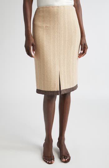 Passementerie-inspired contrast trim details the hem of this knit pencil skirt that showcases rich texture inspired by woven baskets.