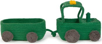 Hop on the tractor and get ready to carry all your little toys around! This two-piece tractor basket, handcrafted from green cotton cords, is packed with details like decorative lights, 8 round pom-poms as tires, and a custom license plate reading "L0R3NA." A practical addition to any child's room, it's sure to inspire hours of imaginative play!