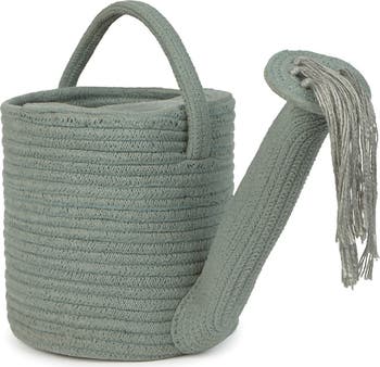 This handcrafted watering can basket features a vintage-inspired design. Its functional size makes it a versatile addition to any room while keeping everything organized. Made with cotton cords filled with recycled PET and string details that mimic flowing water, it offers a large capacity, making it perfect for storing toys, blankets, or any little countryside essentials