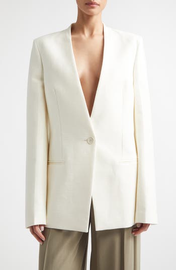Representative of the brand's signature Scandi minimalism, this long jacket is tailored from a textured basket weave woven with a touch of linen and cotton. The barely there shawl collar lends definition to the sharp, clean lines of this tactile and modern piece.